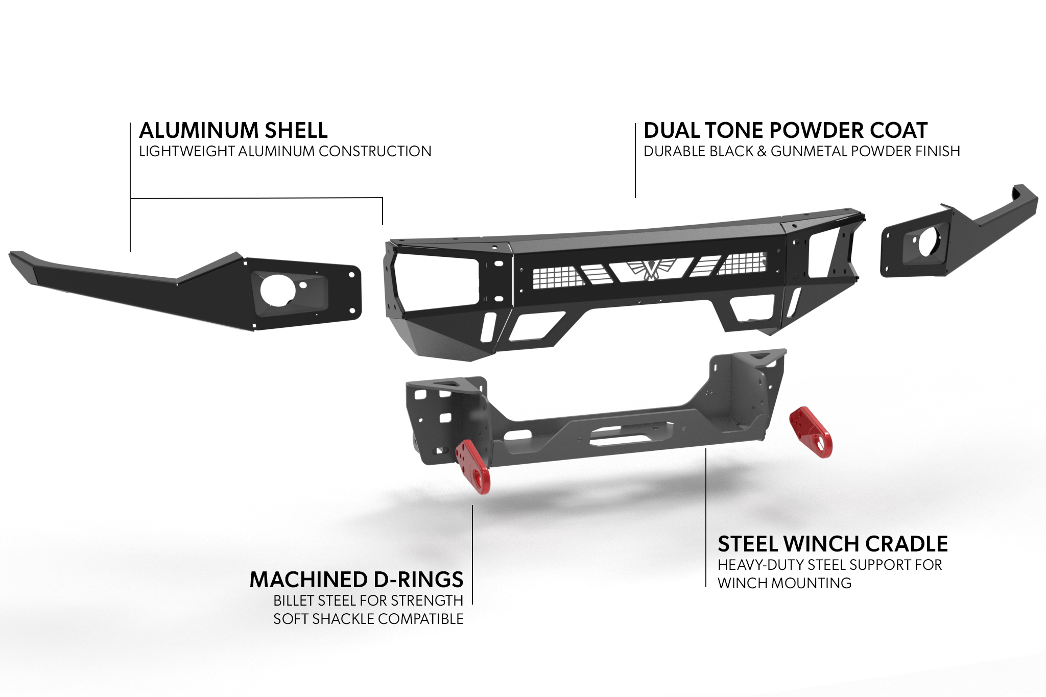 *Will require trimming of the lower radiator shroud to accommodate most large winches (ie. Warn Zeon). All winches will need the control box relocated.